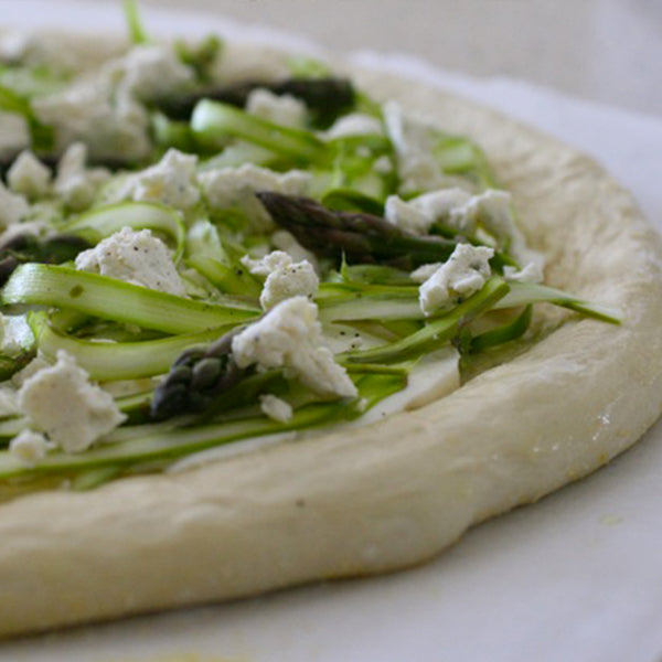 Prêt pour une pizza légère et colorée ? Ici les légumes de saison sont à l'honneur et vont venir ensoleillé votre journée dégustation. Alors préparez vos papilles avec une pizza aux asperges, courgettes et ricotta.