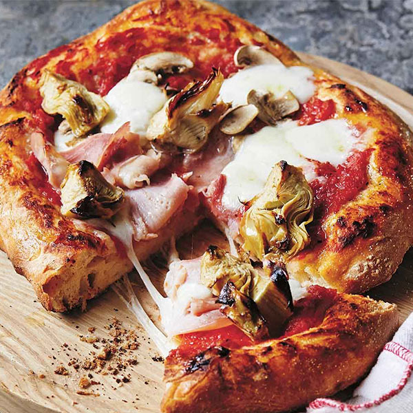 La Capricciosa. Parfait équilibre entre légumes et charcuterie. A base de tomate, mozzarella, champignons, jambon cuit, olives et artichauts, la Capriciosa peut satisfaire tous les palais et apparait comme une valeur sûre.